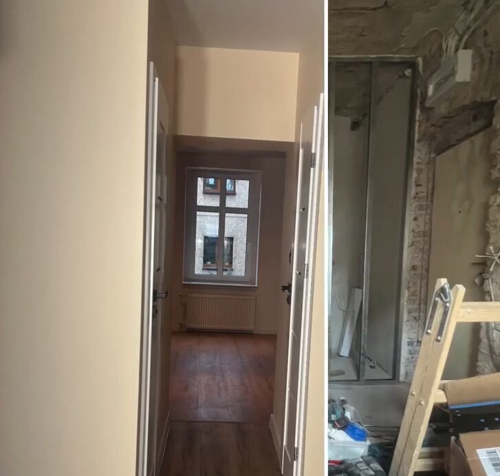 Prace obejmowały kompleksową wymianę instalacji wraz z montażem centralnego ogrzewania, ocieplenie ścian oraz sufitów, poziomowanie całego mieszkania za pomocą konstrukcji drewnianej oraz płyt OSB z uwagi na stan budynku, wymianę okien oraz drzwi, wydzielenie pomieszczeń na łazienkę oraz WC i kompleksowe wykończenie.